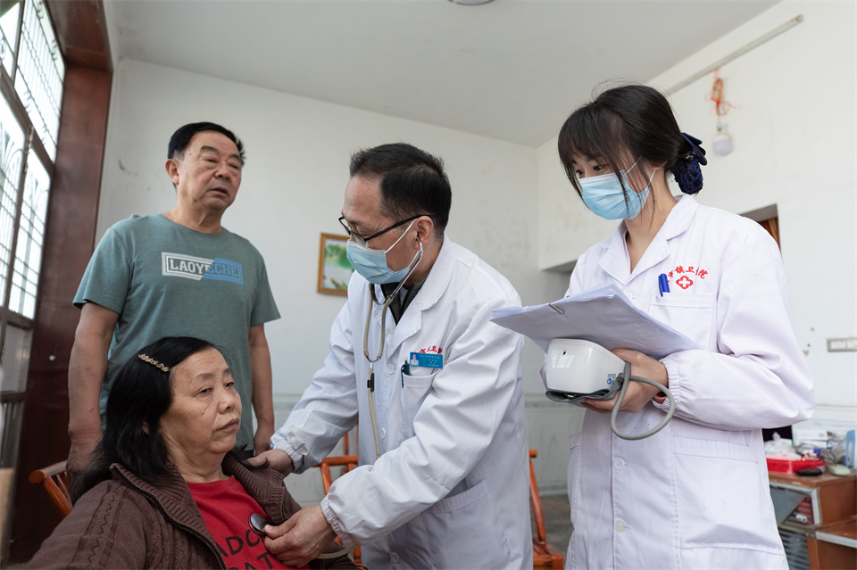 章明芬卒中救治返家后,董市镇卫生院医生仍定期下乡对其随访,老伴李家祥陪同在侧